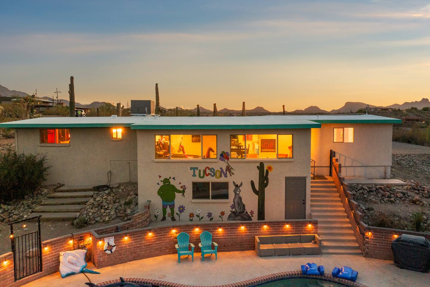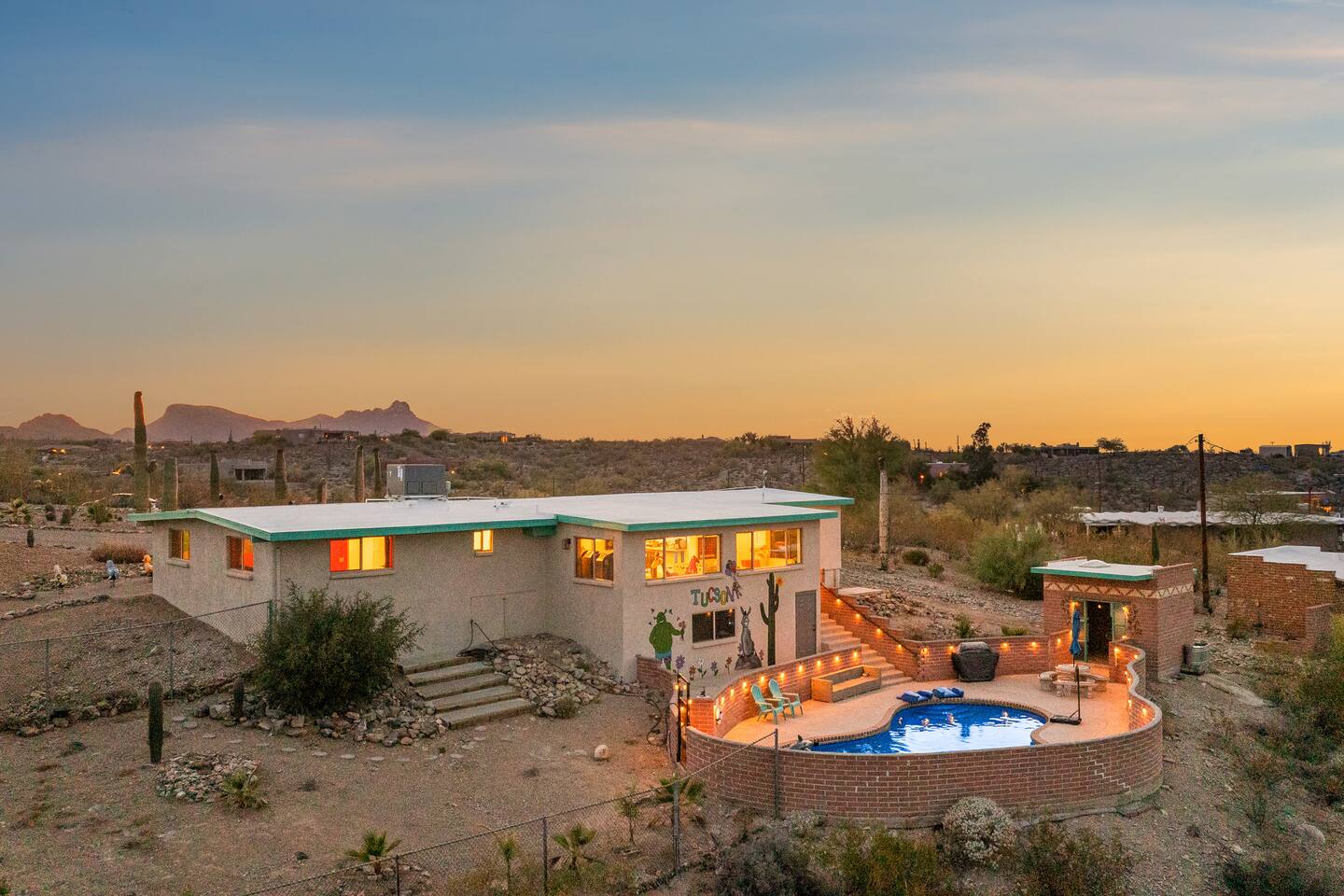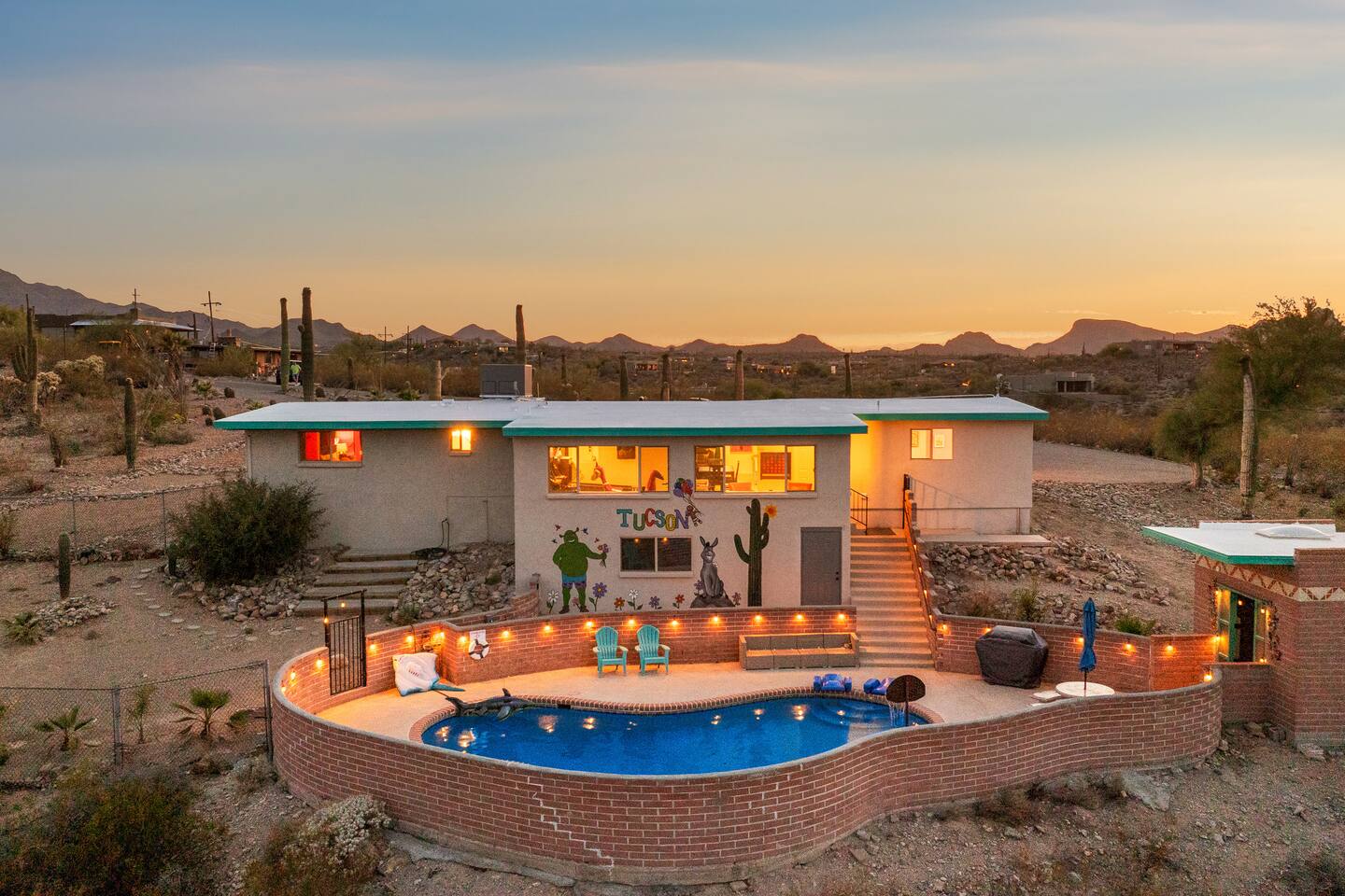 As the sun sets over the Arizona desert, our pool area comes alive with gentle lighting, creating a tranquil atmosphere for evening relaxation. Enjoy a night swim, stargaze, or simply unwind in this serene setting.